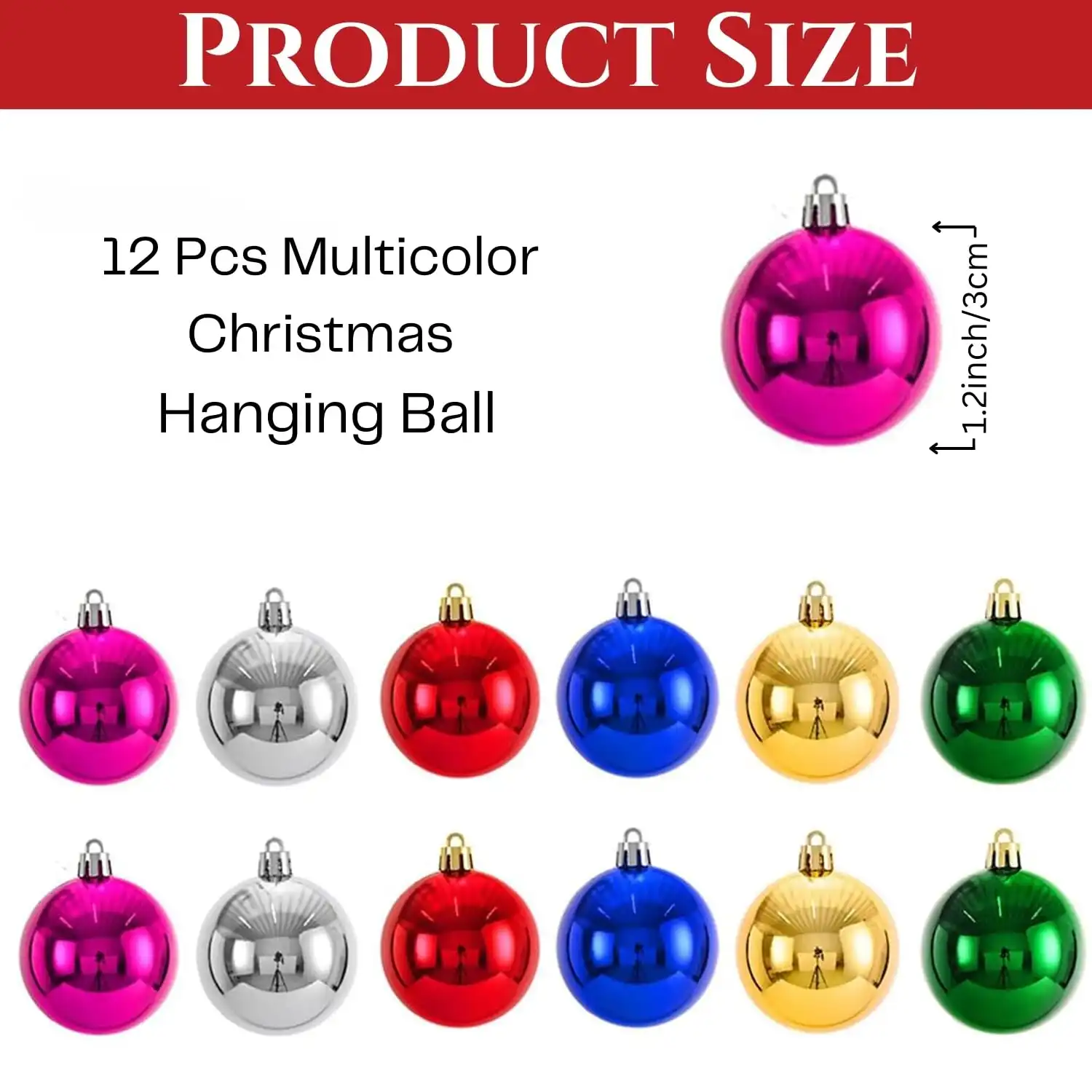 Package Contains : 12Pcs Hanging Balls, Size – 2.5 cm (Multicolor).GIFTS FOR FAMILY: Start a family tradition of every Christmas giving your son, mom, daughter, husband, wife a hand-crafted ornament that fits their personality. Make memories meaningful this Christmas season and spread love and hope this year.DECORATIONS : Ball Ornaments are made from durable and lightweight plastic to provide excellent shatterproof performance. Plastic debris will not cause harm when ornaments were crushed.Best For : Christmas decorations items, christmas tree decoration items, christmas tree decoration ornaments, christmas tree decoration items small, christmas tree decoration items big balls, christmas tree hanging ornament, christmas tree hanging decor, christmas tree hanging decorations, christmas hanging decorations, christmas wall hangings, xmas tree decorations items, xmas decoration items, xmas tree hanging ornament, christmas tree balls, christmas wall hanging decorations, xmas balls.Uses For : Christmas decorations items for home, christmas gifts, xmas gifts, christmas return gifts, christmas gift for office, christmas gift for friend, christmas decorations, christmas decorations items for office, christmas decorations items for outdoor, christmas decorations items for church, christmas decorations items for wall, christmas decorations items for indoor.