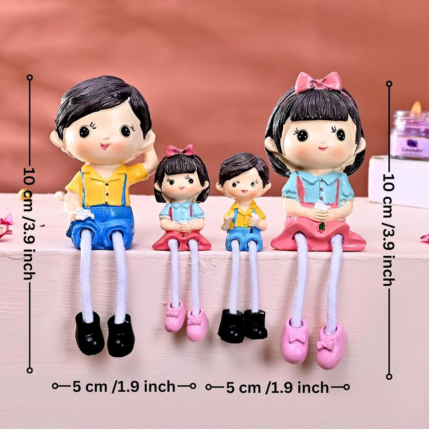 This cheerful and vibrant figurine set beautifully captures the essence of a happy, close-knit family. Featuring four adorable characters?a mother, father, daughter, and son?each figure is styled in bright, playful colors that exude warmth and positivity. The mother and daughter wear matching red skirts with blue tops and pink bow shoes, each adorned with a cute red bow in their hair. The father and son are dressed in coordinating yellow shirts and blue shorts, both wearing black shoes and bright smiles. All figures have dangling rope legs that add a fun, whimsical element to the design, giving them a lively and animated charm. Crafted from high-quality resin with smooth, hand-painted details, this figurine set is perfect for displaying on shelves, ledges, or mantels. It serves as a joyful tribute to family bonds, shared moments, and unconditional love. Ideal as a gift for parents, housewarmings, or special family celebrations, this set brings a sense of happiness and harmony to any space. It’s a delightful reminder of the love that holds a family together.