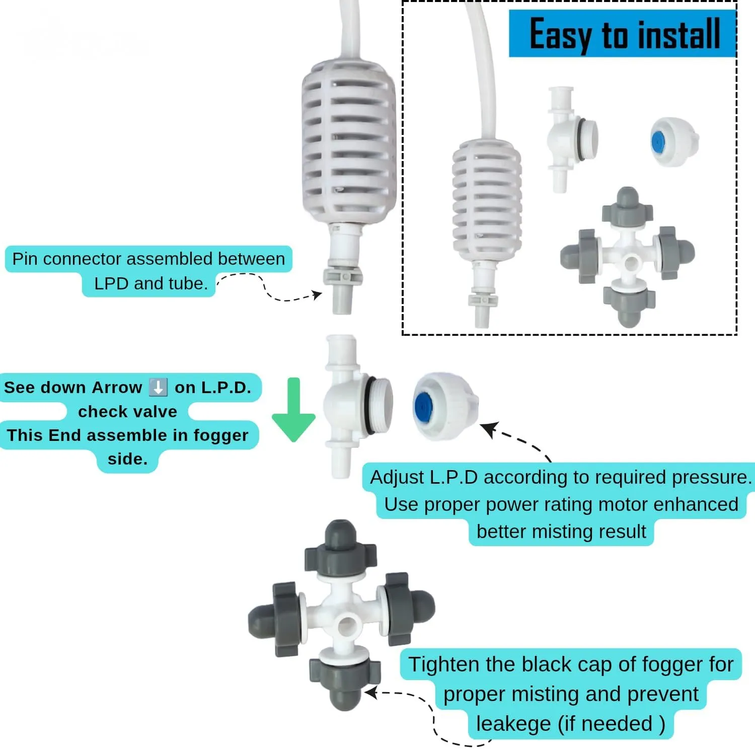Package Content : Premium 4 way Fogger Kit & Water Fogging System (Pack of 10).This 4-way fogger kit provides ultra-fine mist that reduces temperature and increases humidity in gardens, greenhouses, poultry farms, and outdoor areas. It creates a refreshing environment while maintaining optimal moisture levels, making it perfect for plants, pets, and people.Designed to maximize coverage with minimal water use, this fogger system conserves water compared to traditional sprinklers. The fine mist ensures plants get sufficient hydration without overwatering, supporting sustainable irrigation and reducing water bills.From cooling outdoor spaces and gardens to maintaining greenhouse humidity and reducing poultry heat stress, this fogger adapts to multiple environments. It?s equally useful in industrial areas for dust suppression, offering all-in-one functionality.The system is lightweight, compact, and simple to install with standard pipes or pumps. Cleaning and maintaining the nozzles is hassle-free, preventing clogs and ensuring consistent mist output for years of dependable use.