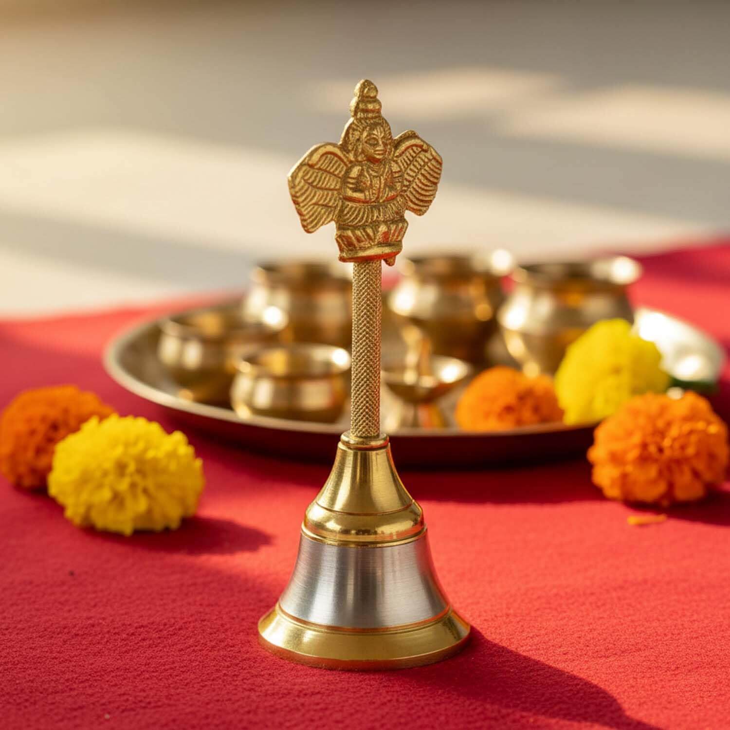 Enhance your home temple with this exquisite Garuda bell. Made of dual-toned brass and silver, it features an intricately crafted Garuda figurine at the handle. Its resonant sound creates a peaceful environment, making it a perfect addition to your puja ceremonies.