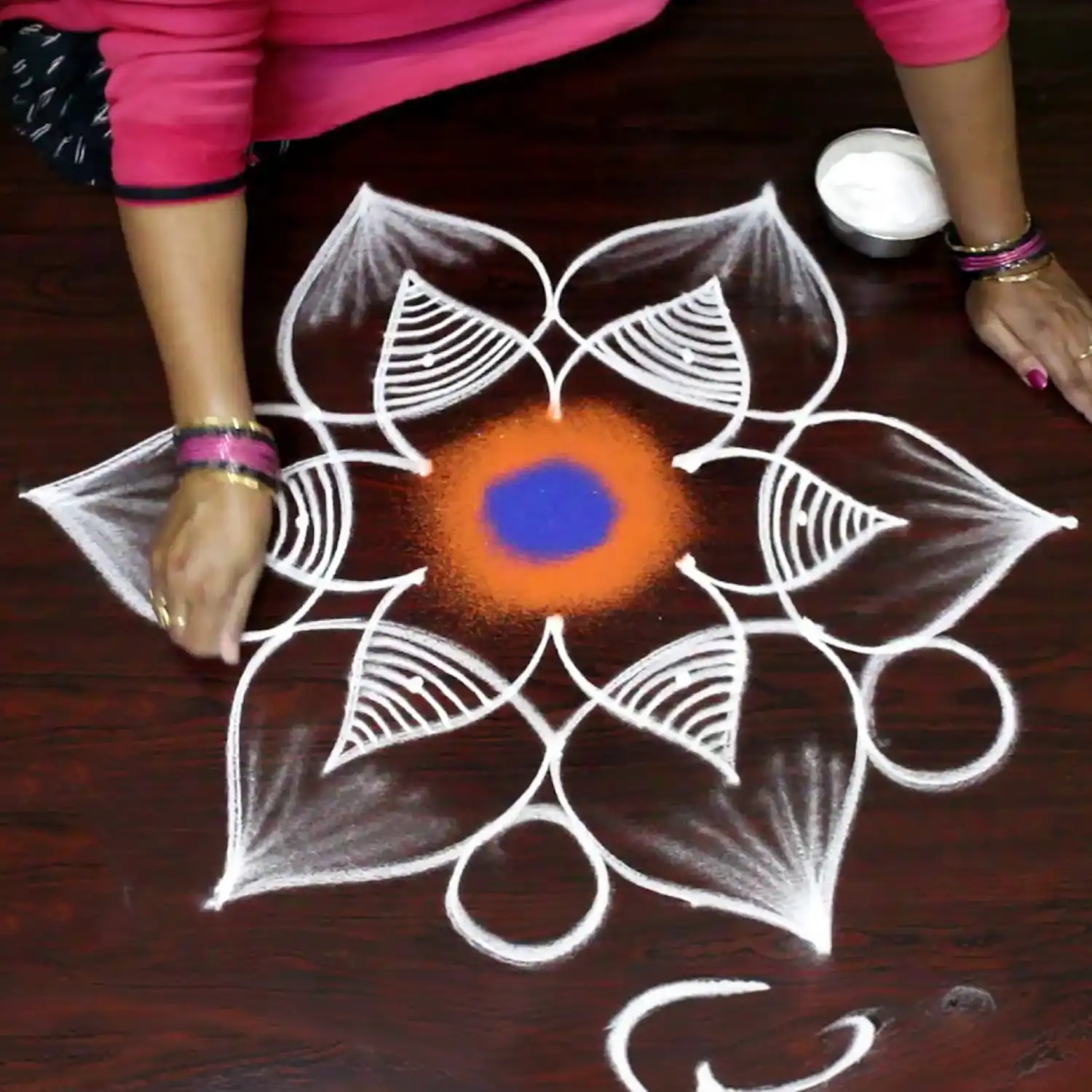 It is usually made during diwali (Deepawali), wedding, onam, pongal and other indian festivals. . Colour is made of sawdust. These colors are eco friendly.rangoli is a native of indian culture and is used in every festive occasion to decorate one’s house. These colors spread positive vibrations within the environment and make to lively and entertaining.it also signify a warm welcome for visitors. Many traditionalists also believe that drawing of rangolis on the floor near the main doorway of the house warded off evil spirits.