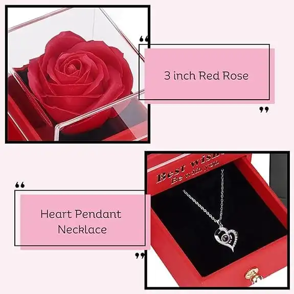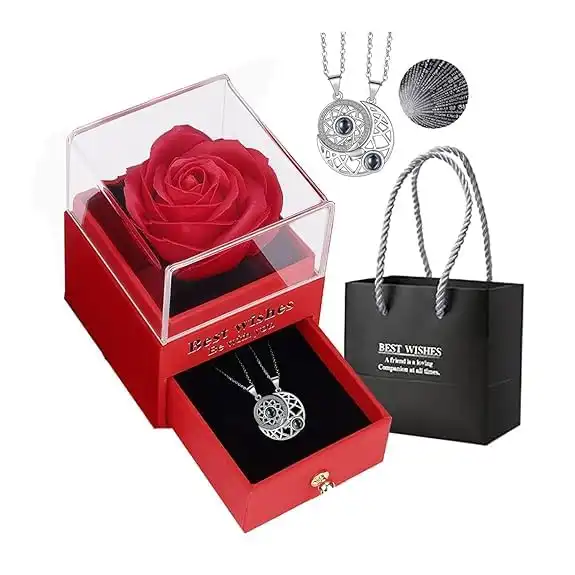 • This red rose jewelry gift box has a small drawer. It with a 100 Languages “i love you” Moon pendant necklace in it. Tell her you will love in a hundred ways. Also you can put your own gifts, like earrings, necklaces, rings, or other jewelry in the drawer or among the roses to create more surprises for her.