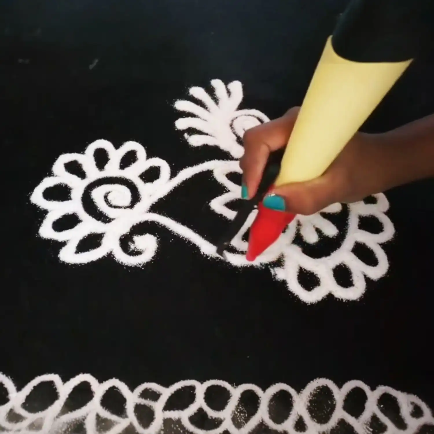 It is usually made during diwali (Deepawali), wedding, onam, pongal and other indian festivals. . Colour is made of sawdust. These colors are eco friendly.rangoli is a native of indian culture and is used in every festive occasion to decorate one’s house. These colors spread positive vibrations within the environment and make to lively and entertaining.it also signify a warm welcome for visitors. Many traditionalists also believe that drawing of rangolis on the floor near the main doorway of the house warded off evil spirits.